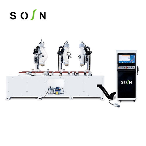 功能: 門套鎖舌,合頁安裝孔、槽的加工。特點(diǎn):自動(dòng)對(duì)刀功能,保證換刀,斷刀更換時(shí)的加工精度。 主軸正反旋設(shè)計(jì)銑削,確保加工不崩邊,崩角,提高加工質(zhì)量。 門套鎖舌,合頁功能,門套寬度方向夾緊靠料功能,確保門套長度方向上的彎曲。 氣動(dòng)夾具夾緊,可根據(jù)加工長度靈活調(diào)整,滿足不同長度門套